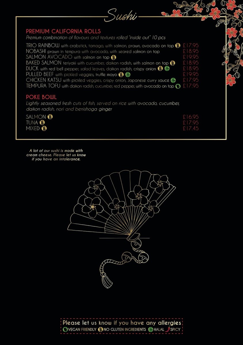 Premium combination of flavours and textures rolled “inside out” 6 pcs. raw salmon, avocado with raw salmon on top , mayo sriracha sauce